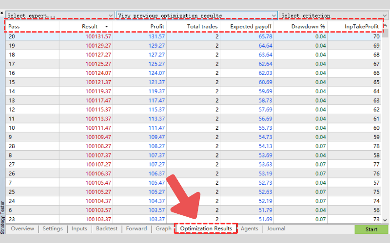 After the forward test is complete, check the "Optimization Results" tab, where the results will be displayed in a list.