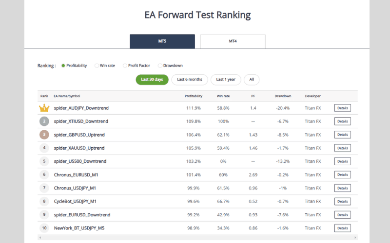Titan FX provides free Expert Advisors (EAs) and forward test results to help traders choose the right trading strategy.