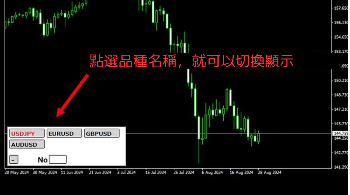 | 商品名称 | 登录要显示在面板上的商品名称。输入多个商品名称时,商品名称之间用「,」分隔。输入范例「USDJPY,EURUSD,GBPUSD」 | --- |