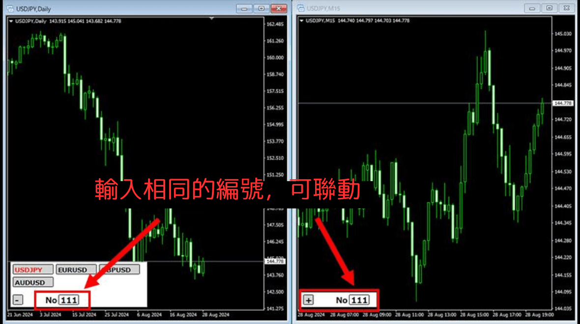 在多个图表上启动指标,输入相同编号让图表产生连结后,只要点击一下即能切换多个图表的商品名称。