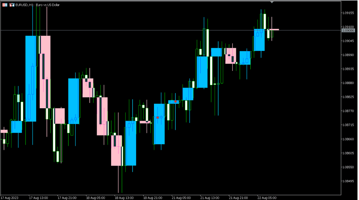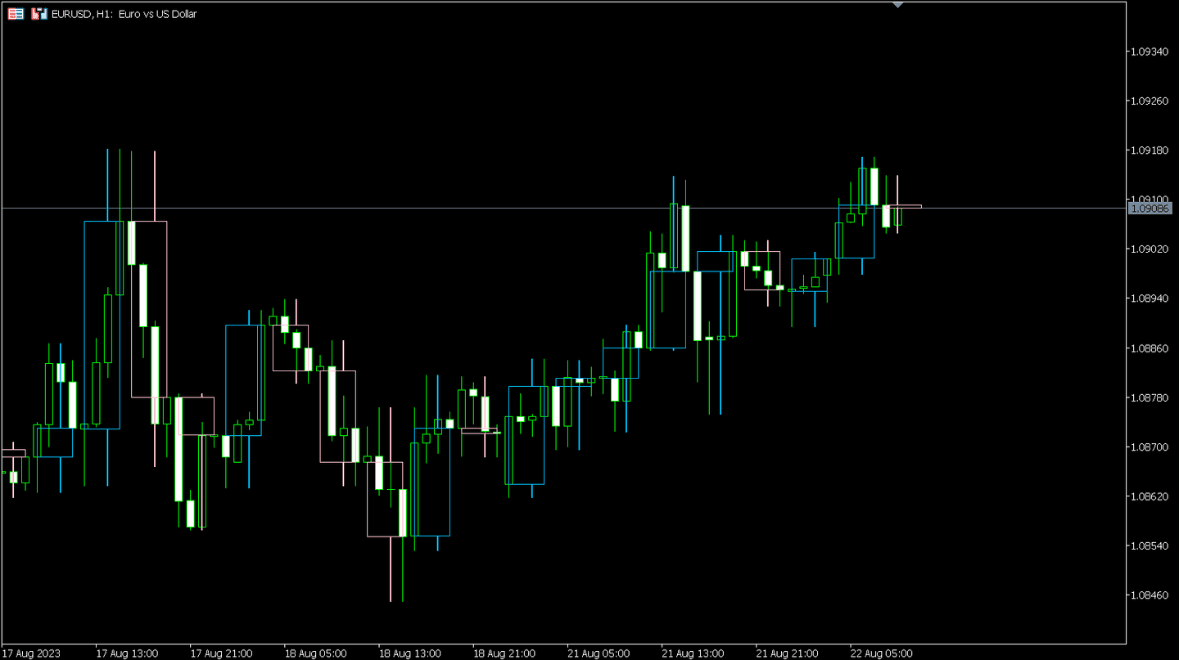 本指标能重叠显示比目前图表K线周期更长的K线。 重叠显示长周期K线的形状,有助于掌握价格大幅度波动并进行分析。
