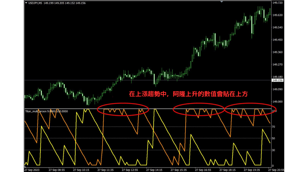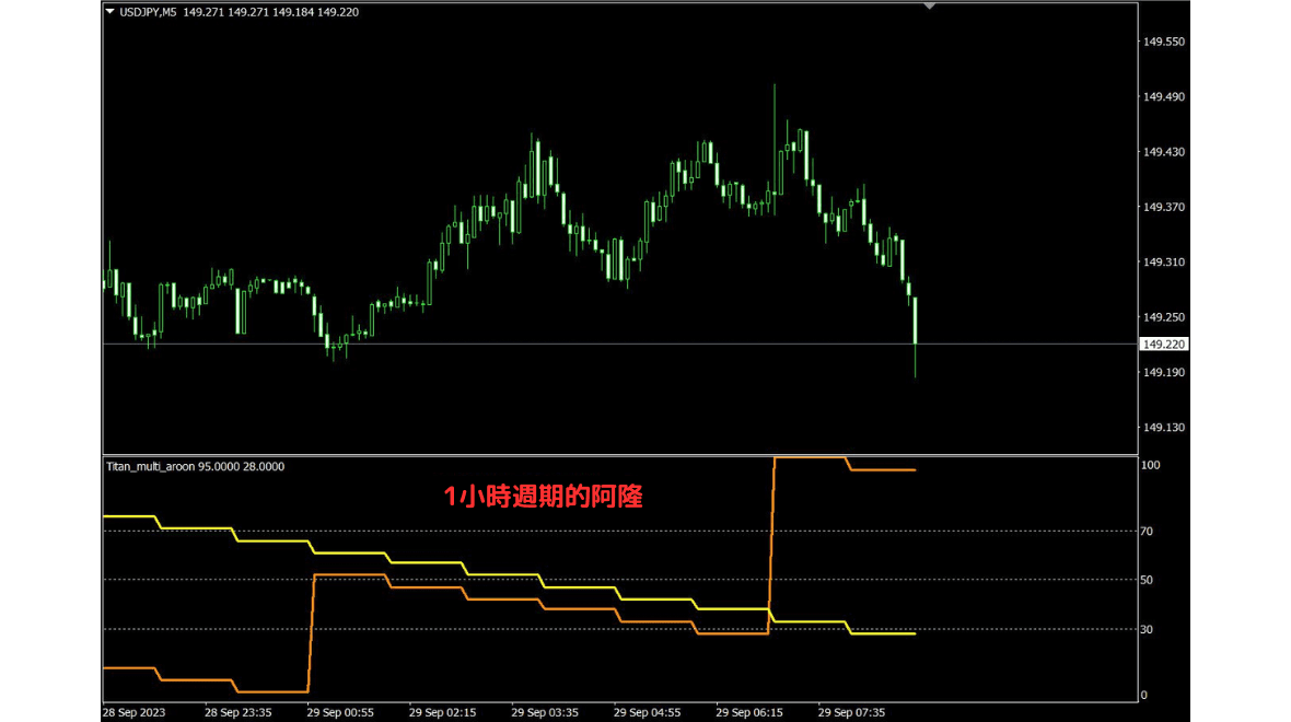 【美元/日圆的5分钟图表上显示1小时阿隆指标的范例】
