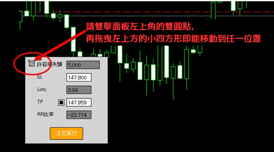 要以图表上的线条指定时,启动工具后将注记「SL」的线条,移动至想下止损单的水平。 (移动方式与一般水平线相同。)