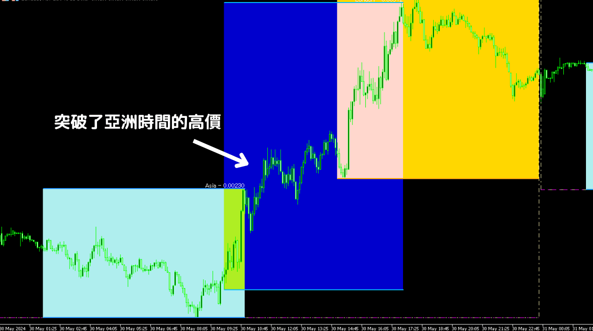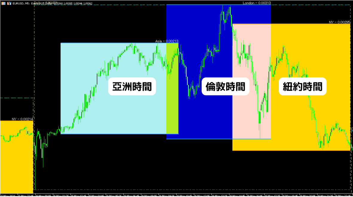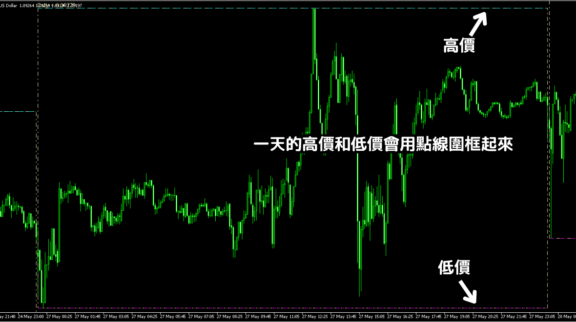 【用方框圈出亚洲时间、伦敦时间、纽约时间最高价、最低价水平的范例】
