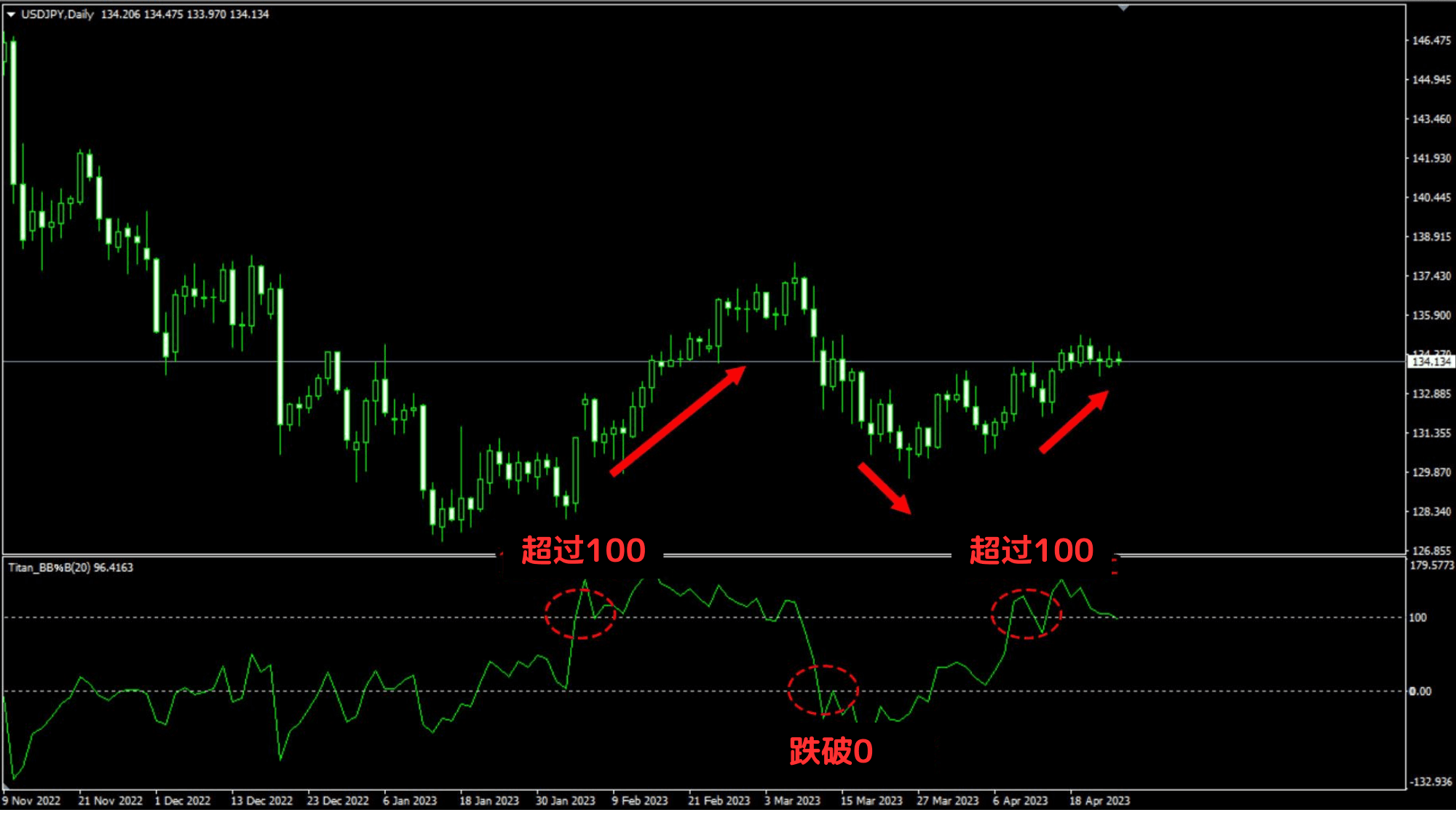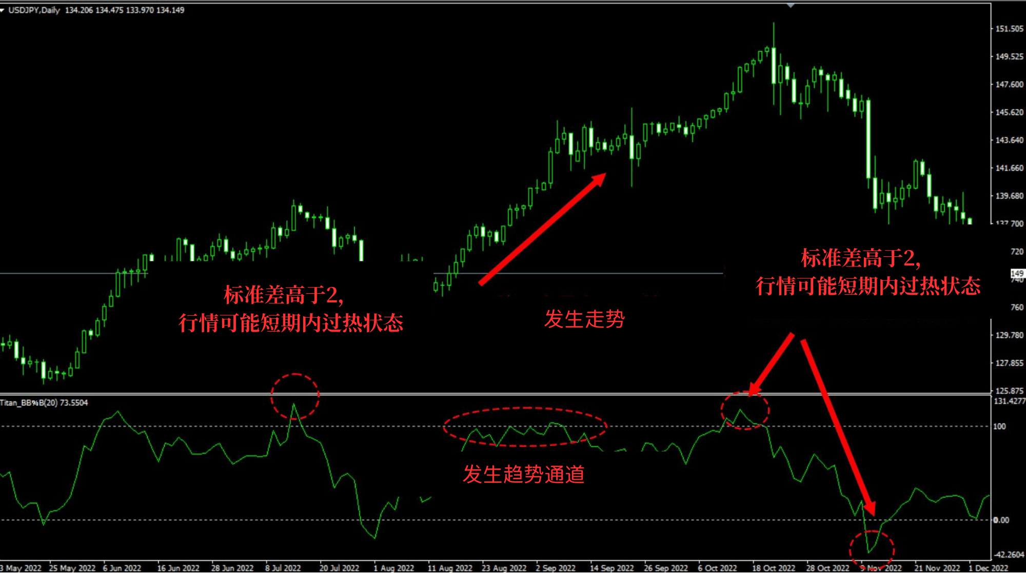 布林极限指标%B将标准差设定为2时,+100的水平为标准差2,0为标准差-2的水平,即使未显示布林通道,仍然可以探求趋势通道的发生及汇率市场过热的感觉。