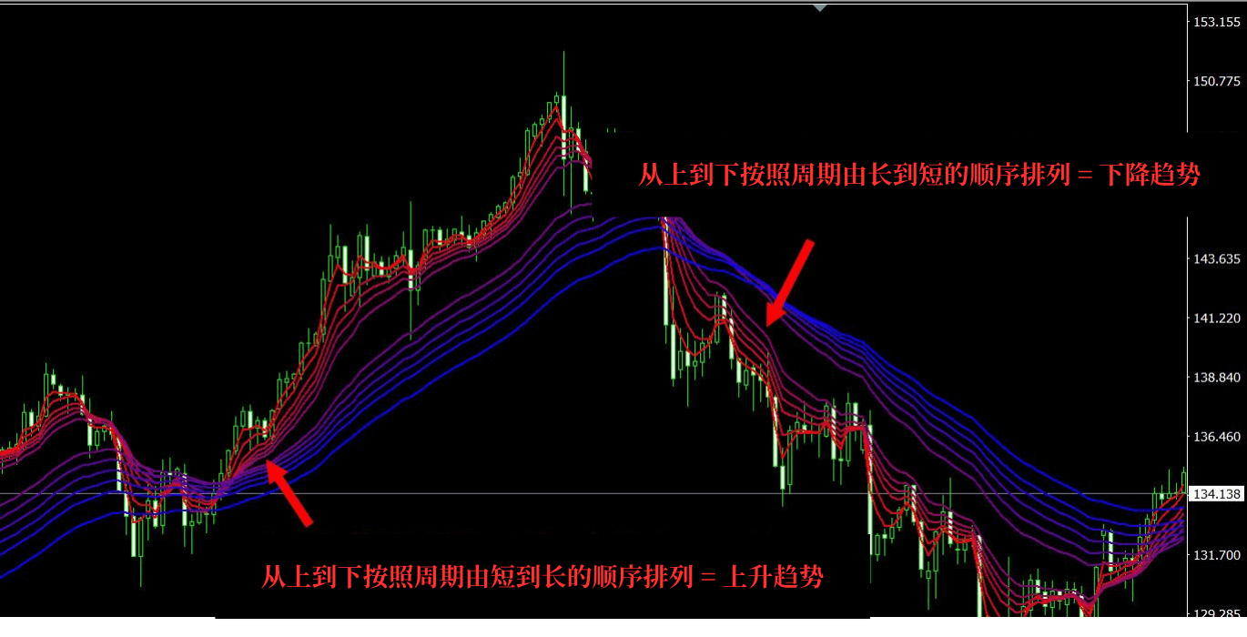 在GMMA中,显示了具有不同周期的多条移动平均线,如果这些移动平均线的排列顺序是从上到下按照周期由短到长的顺序排列,则可以判断为强烈的上升趋势;如果是从上到下按照周期由长到短的顺序排列,则可以判断为强烈的下降趋势,这增加了对趋势持续性的期望。
