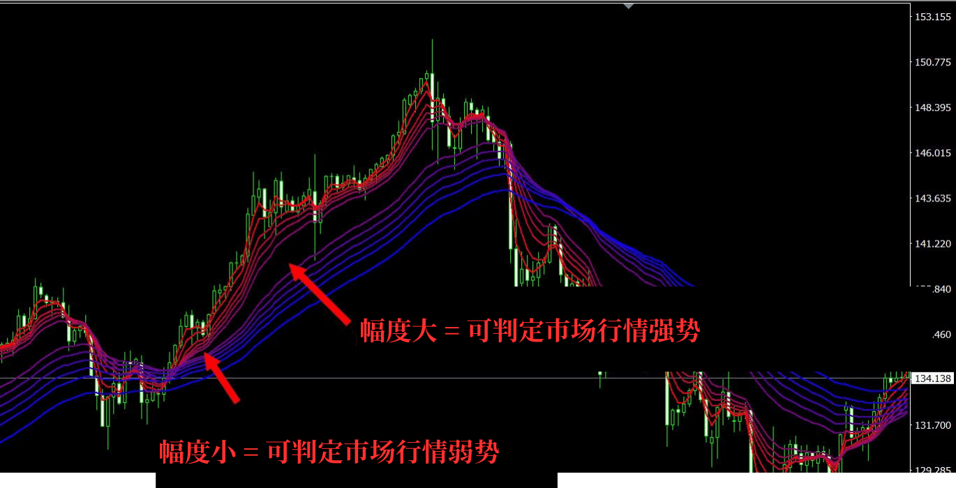 GMMA在趋势发生中的时候,会注意各移动平均线分布状况(幅度)。移动平均线幅度大时,短周期EMA的波动将变大,可判定市场行情强势。