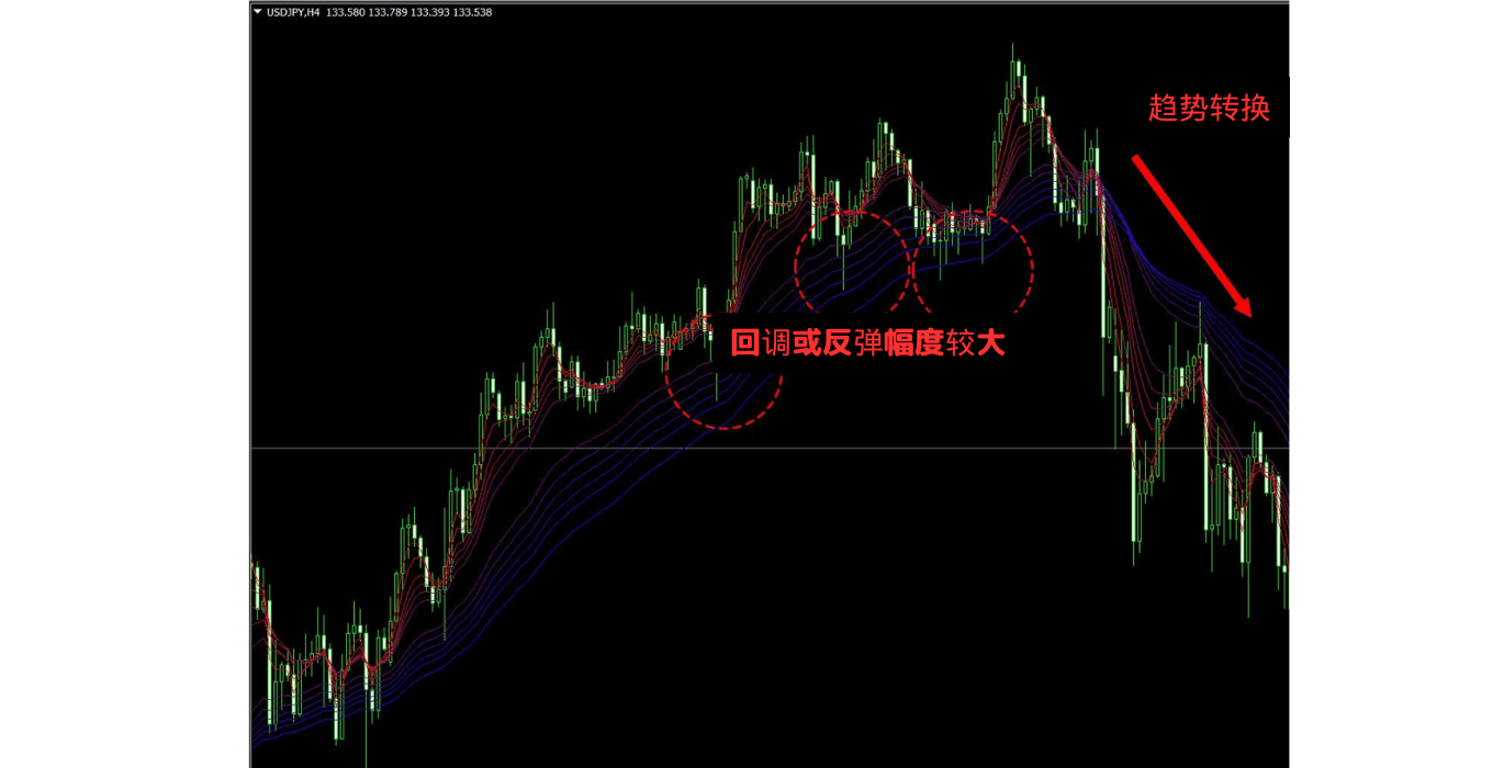 在GMMA中,当趋势发生时,也会关注回调和反弹达到的水平。如果回调或反弹幅度较大,需要注意趋势动能可能减弱的可能性。
