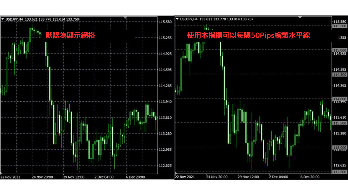 不显示MT4、MT5的格线而显示本指标时,将产生在适当水平显示水平线的完美图表。