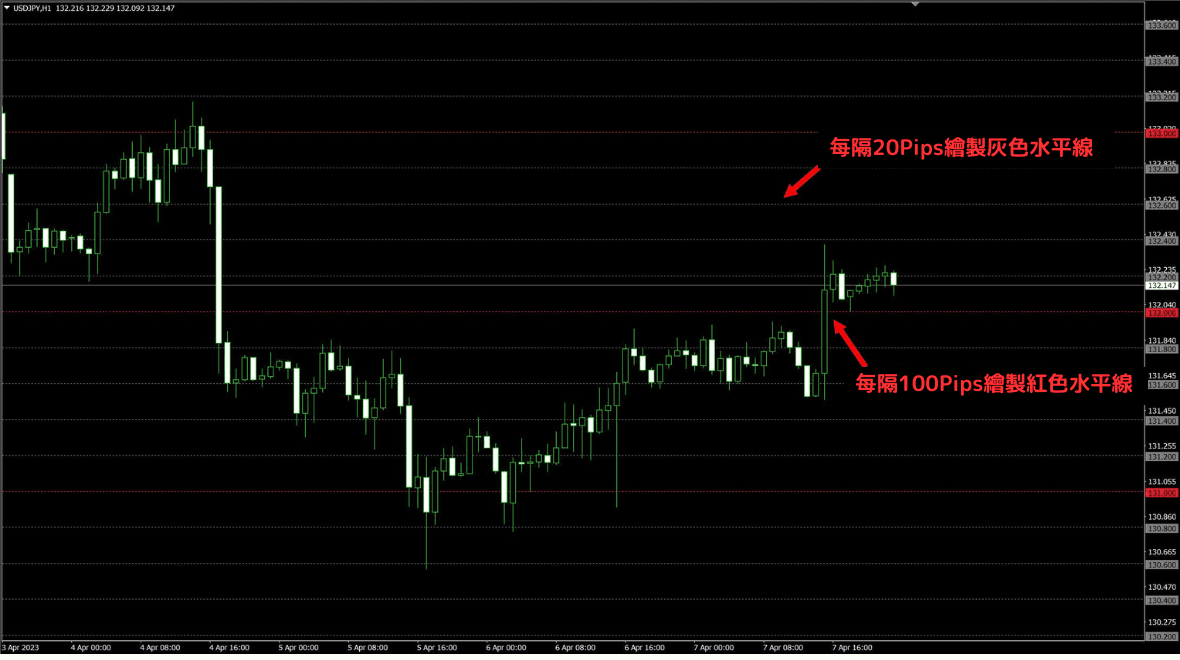 【每隔20Pips画一条灰线、每隔100Pips画一条红线时的范例】