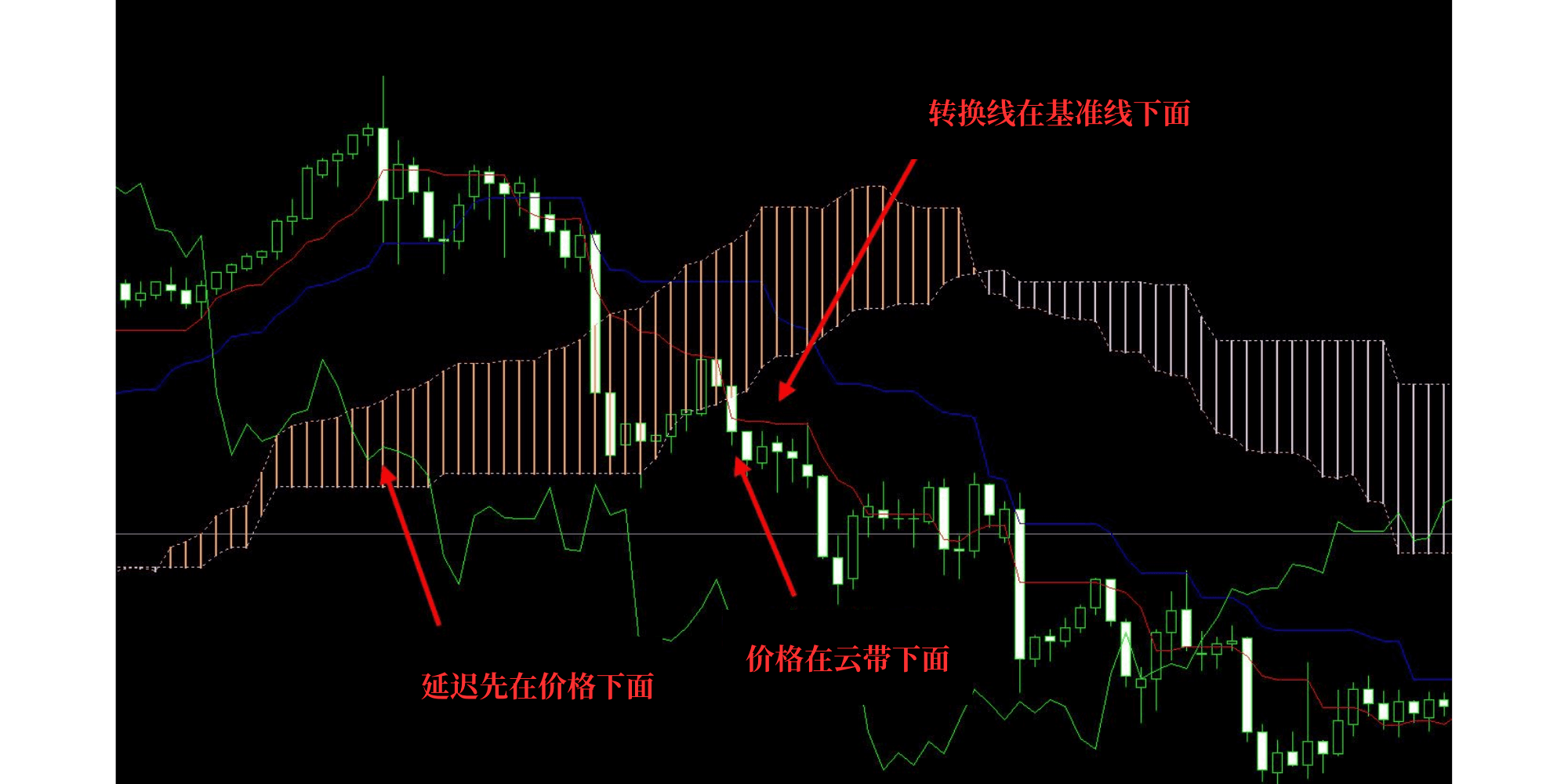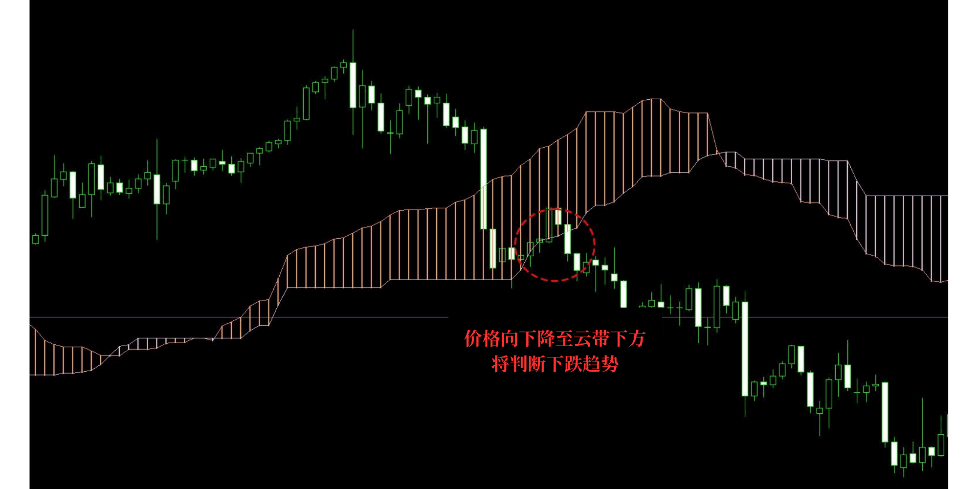 一目均衡表先行带1与先行带2之间的区域称为云带,价格向上超过云带时,代表上涨趋势强烈,相对地,当价格向下降至云带下方时,将判断下跌趋势强烈。