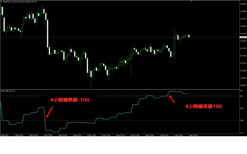 例如在1小时的图表上,显示4小时及一整天的CCI并进行分析。