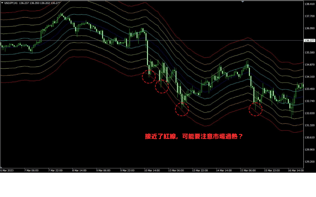 各线条的偏离率可依交易品种、周期任意设定数值。自行尝试各种组合,找出最佳的方式。