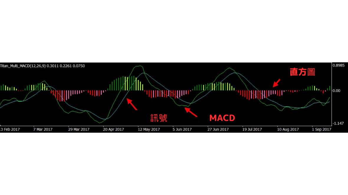 水平在0以上且MACD下滑低于讯号时,视为卖出讯号,水平低于0且MACD超过讯号时,视为买进讯号。