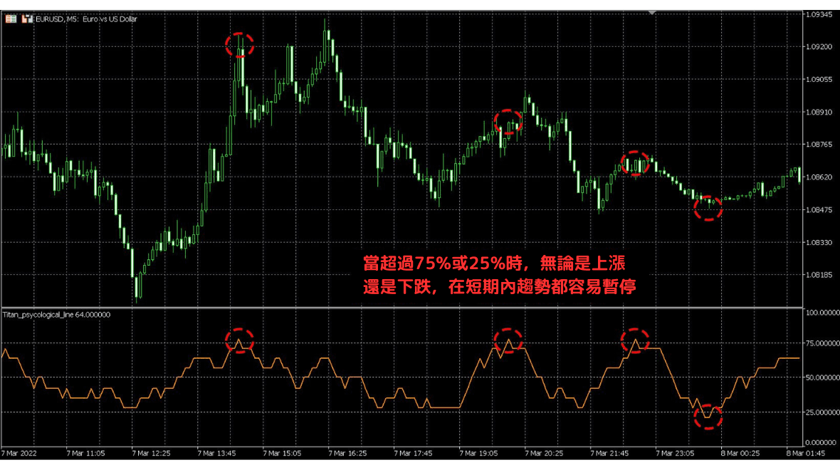 下列图片是心理线发挥功能,在75%及25%附近市场短期反转的范例。