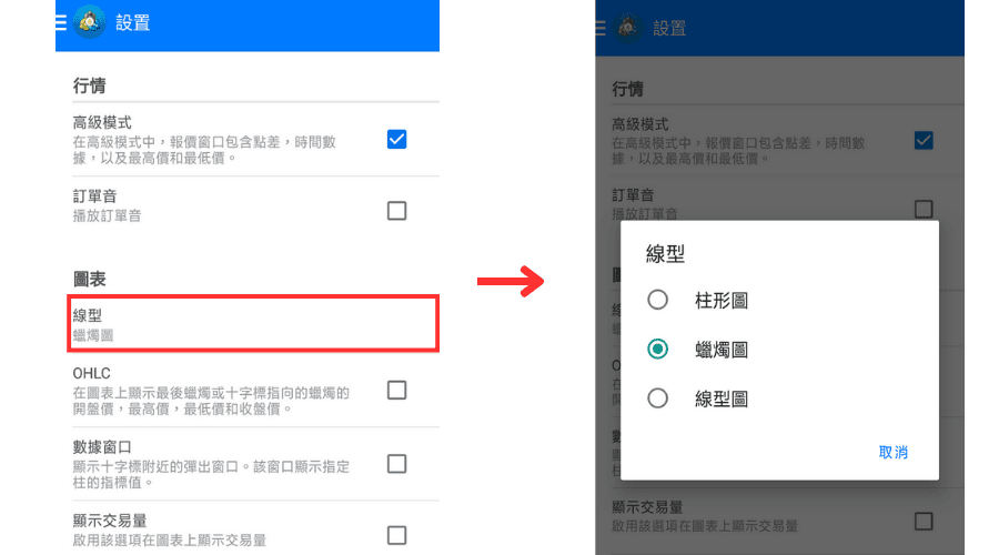 想要变更图表种类时,在图表左上方选单的「设置」中可以进行。