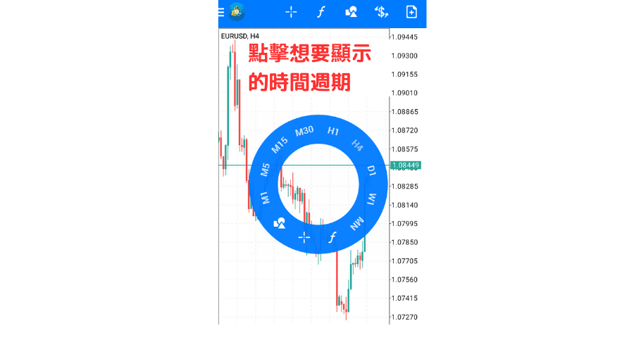 变更时间周期时,点击图表中点击一下就会出现圆形选单,然后在选单中点击想要显示的时间周期。