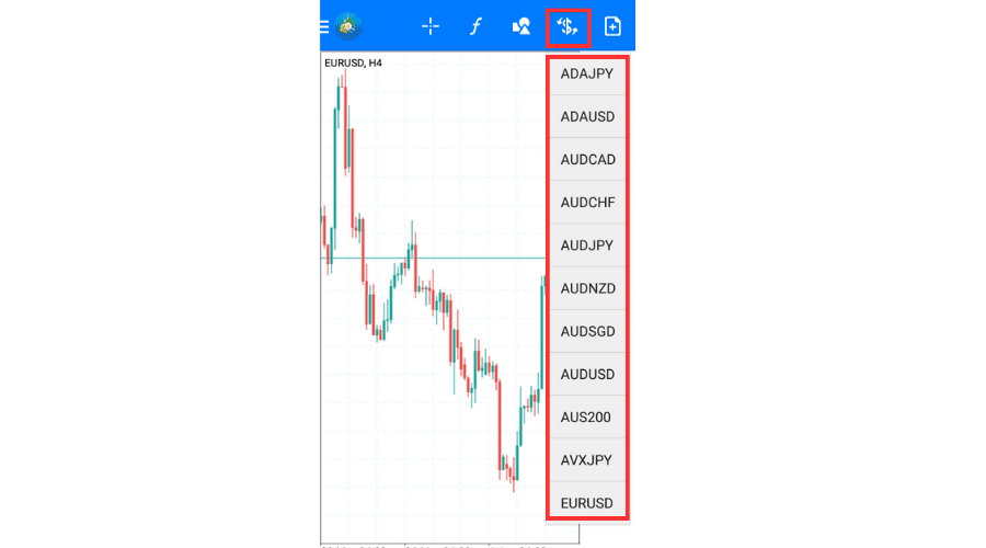 变更交易品种时,点击图表上方的「$」图标就可以选择其他交易品种。