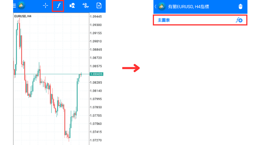 在图表中添加指标时,点击图表上方的指标图标(f形图标),在「指标」界面中点击「主图表」。