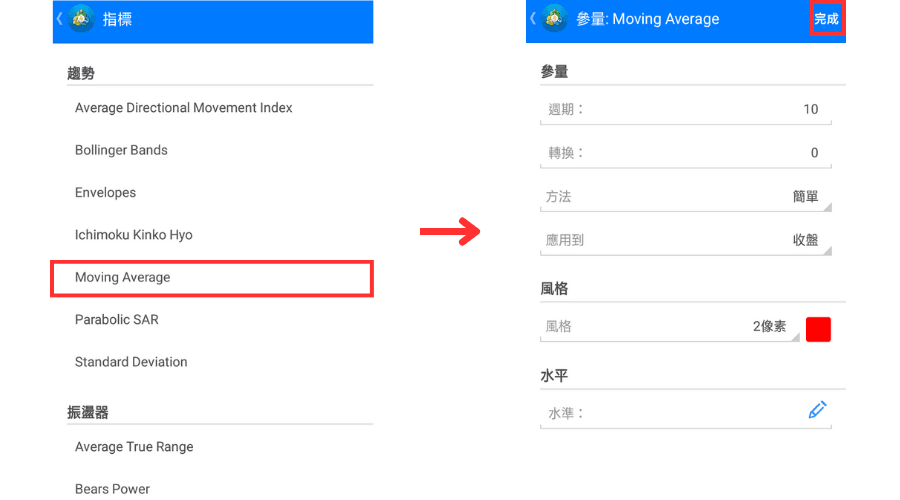 在指标列表中点击想要添加的指标,设置好参数后,点击右上方的「保存」,这样就可以在图表中显示指标。