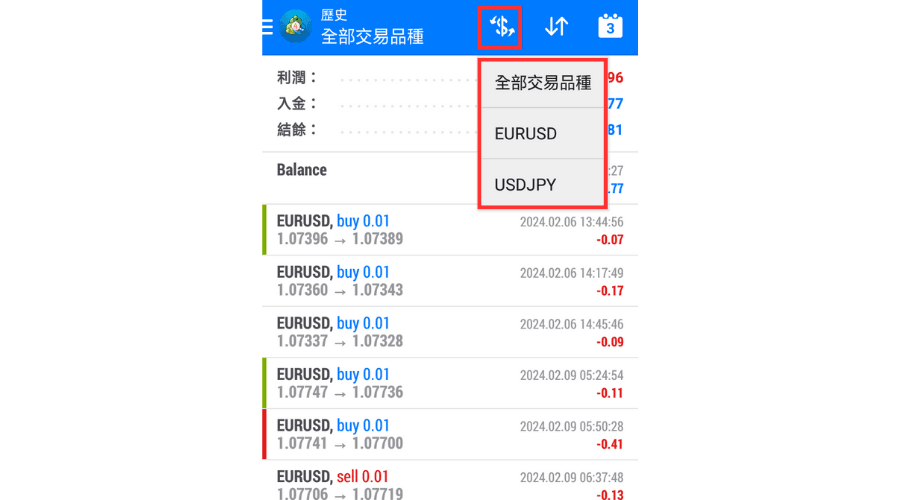 点击交易历史界面上方的「$」图标,这样就可以指定在交易历史中所显示的交易品种。