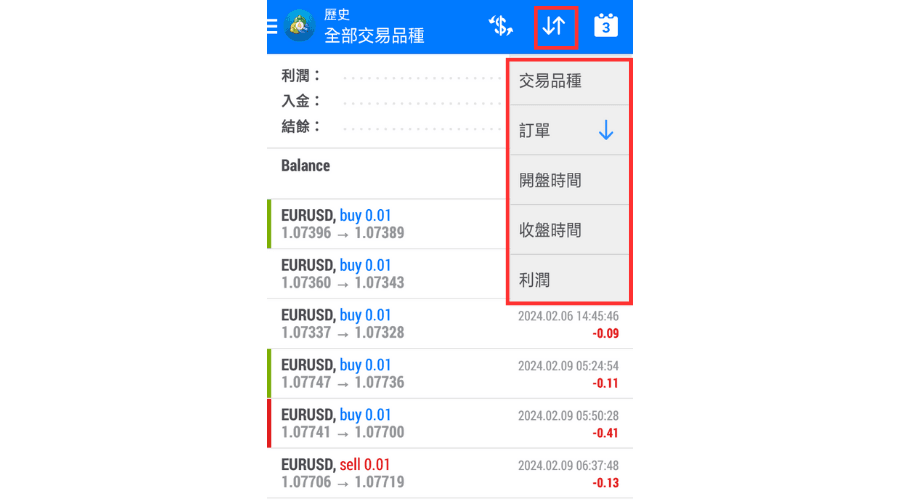 点击交易历史界面上方的「上下箭头」图标就会显示选单,可以根据自己的需求修改排列顺序。