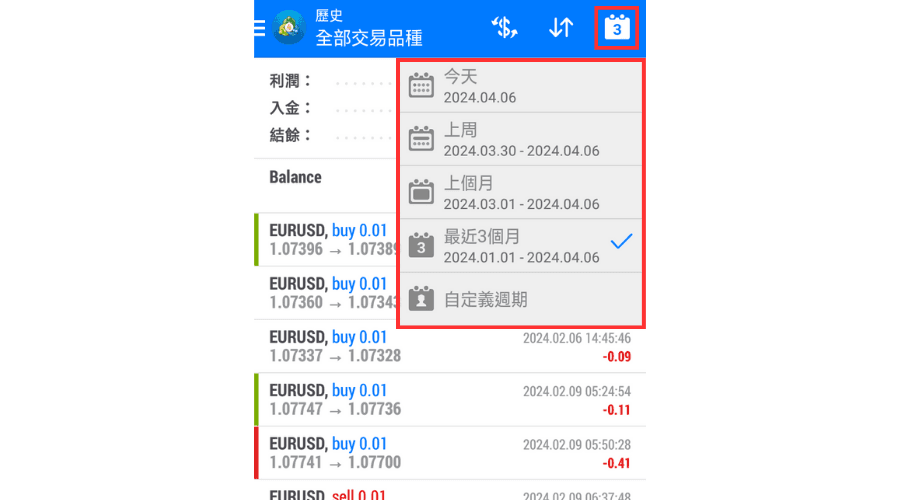 点击交易历史界面上方的「日历」图标,可以选择想要显示的周期。