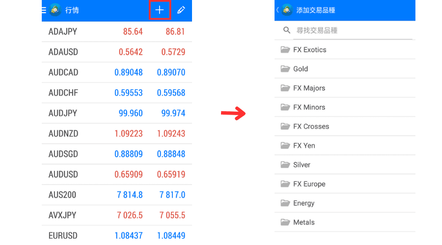 在行情界面中点击上方的「+」按钮就会转到添加交易品种的界面。