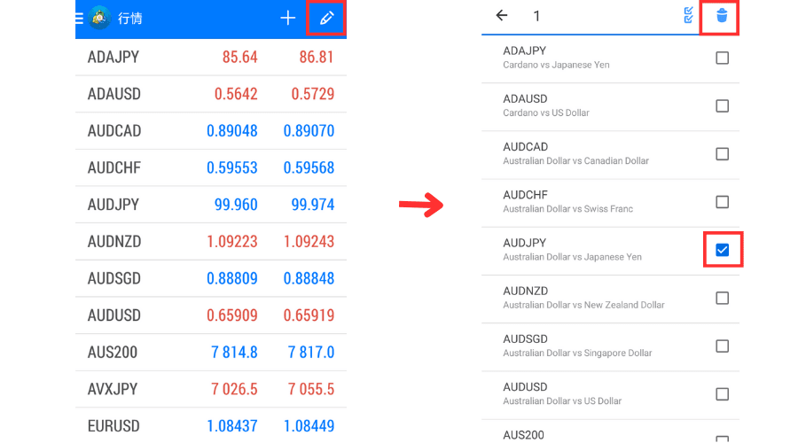 点击右上方的垃圾桶图标后,勾选想要删除的交易品种,然后再次点击垃圾桶图标,这样就可以删除。