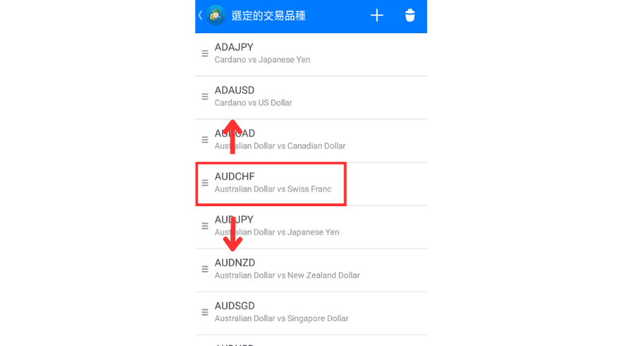在行情界面中点击上方的笔形图标,然后上下拖动交易品种就可以修改排列顺序。