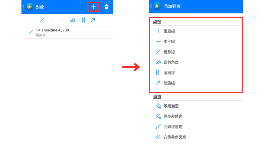 在对象界面中点击上方的「+」按钮就会转到对象列表的界面,然后选择想要添加的对象。 另外,点击「收藏对象」中的对象图标也可以添加到图表中。