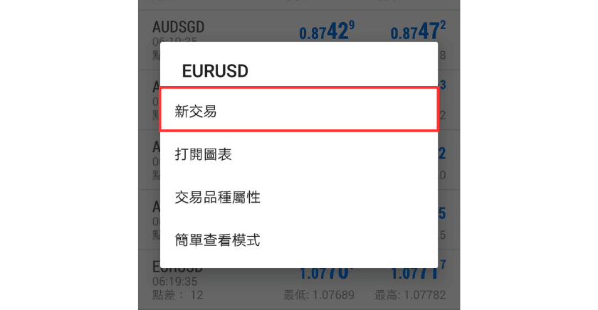 点选「行情」界面中任意一个交易品种,并点选「新交易」。