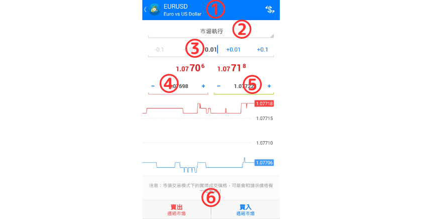 完成①~⑤设定后,点选⑥中任意一个选项,市价单就会被执行。