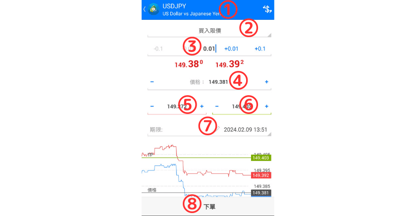 根据当前市场行情及自己的分析设定「挂单」的参数,并点选「⑧下单」完成挂单的设定。