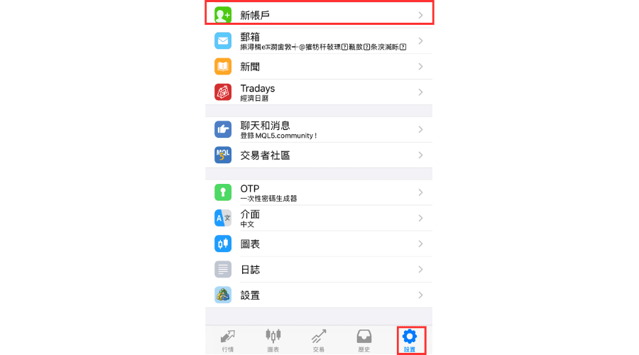 添加账户时,点击底部导航下方的「设置」,然后再点击「新账户」。