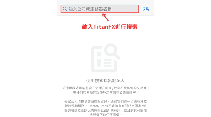 在「输入公司或服务器名称」的空栏中输入「TitanFX」进行搜索。