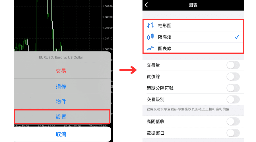在iOS版MT4中可以使用「柱形图」、「阴阳烛」、「图表线」3种图表。