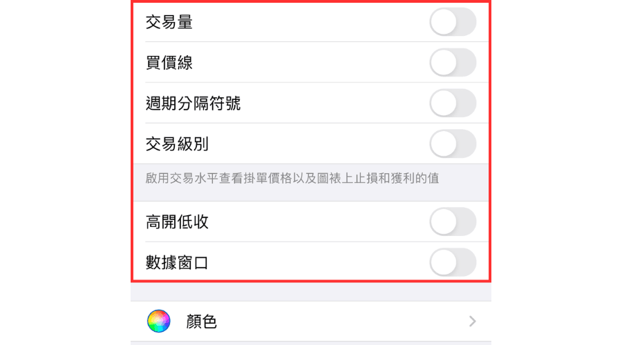 在iOS版MT4中可以切换是否在图表中显示交易量、价格变动量、卖价线、周期分隔符号、叫订单、交易持仓、SL/TP水准、交易历史、预加载图表数据、高开低收 、数据窗口(使用十字线时可以显示指标数值等)。