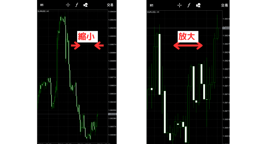放大和缩小图表时,可以在图表中用2个手指捏放来进行调整。