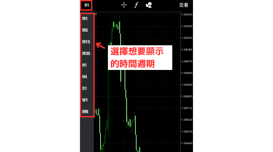 变更时间周期时,点击图表左上方的时间周期,这样就会显示时间周期一览,然后点击想要显示的时间周期。