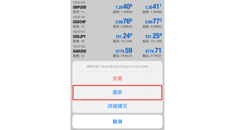 在行情界面中点击想要显示图表的交易品种,然后点击选单中的「图表」,这样就可以显示该交易货币的图表。