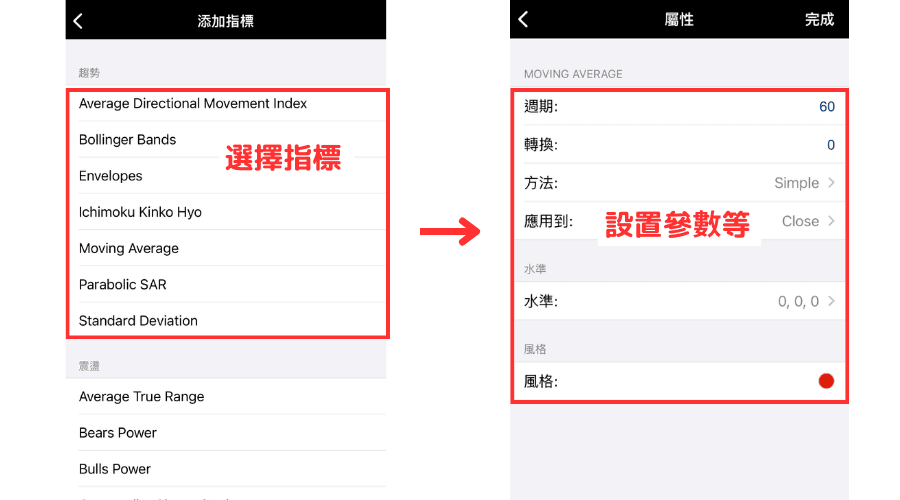 在指标列表中点击想要添加的指标,设置好参数后,点击右上方的「完成」,这样就可以在图表中显示指标。
