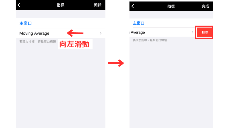 在想要删除的指标名称处向左滑动,就会显示红色「删除」按钮,然后点击一下就可以了。