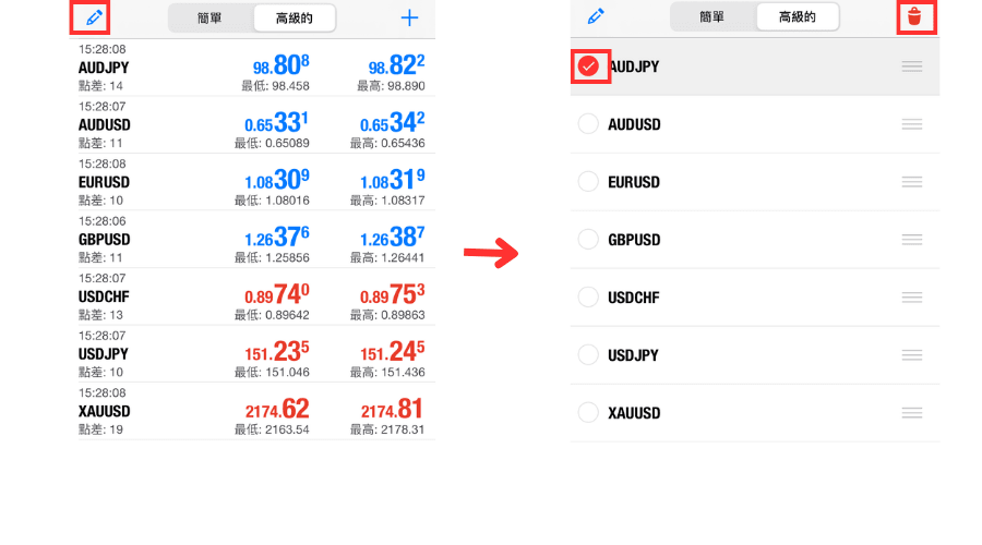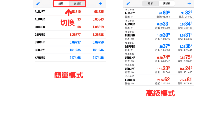 在iOS版MT4中的行情界面有简单模式与高级模式。