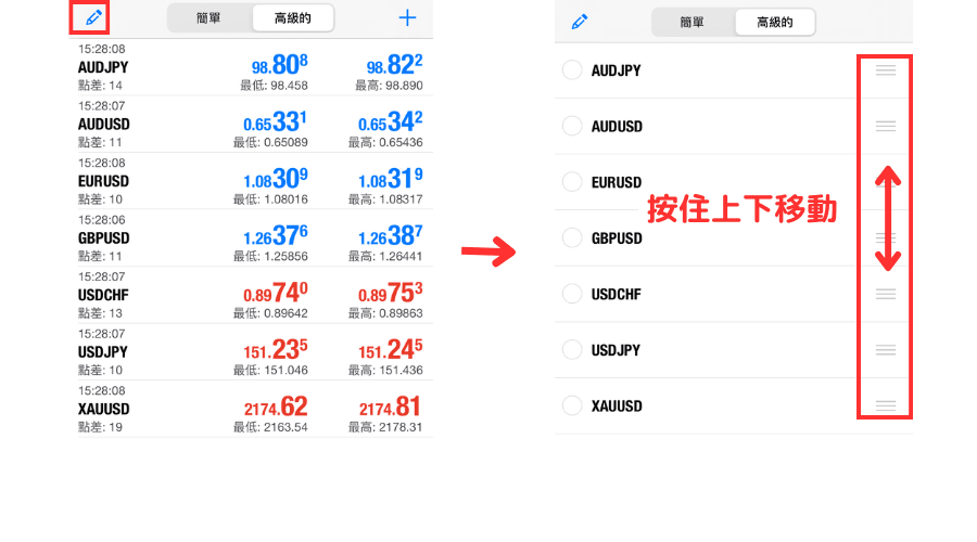 点击行情界面右上方的笔形图标,显示交易品种一览后,按住交易品种右边的图标上下移动就可以修改排列顺序。