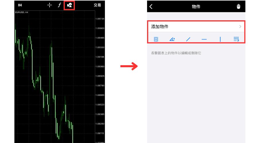 在iOS版MT4图表中使用线条等物件时,点击图表界面上方右边的图标,然后点击「添加物件」,从物件列表中选择想要使用的物件。