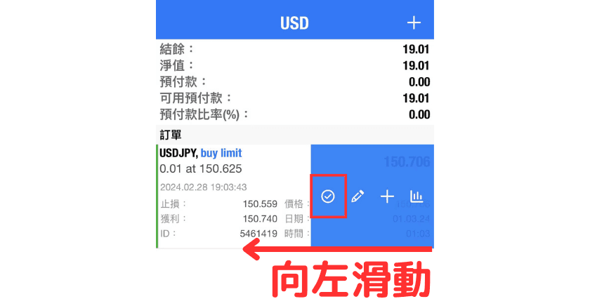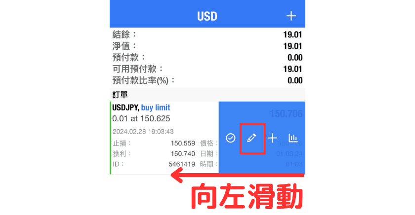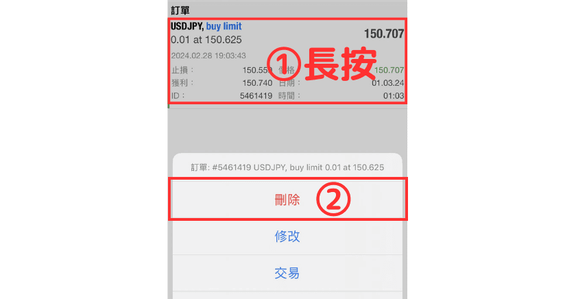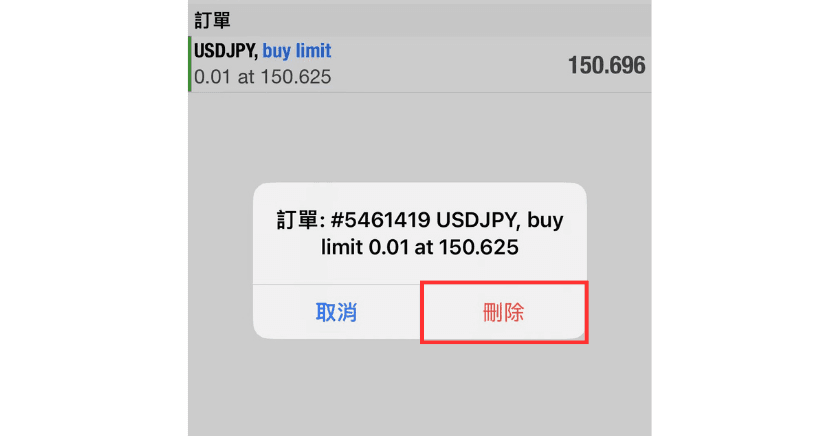 iOS版(iPhone/iPad)MT4中修改或取消限价挂单/停损挂单的方法