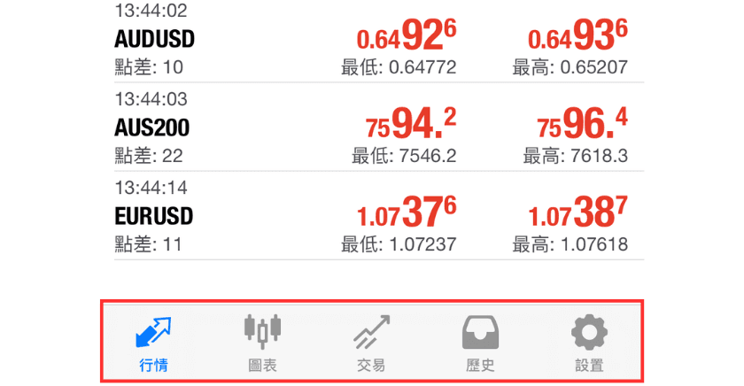 iOS版MT4通过底部5个选单栏切换各画面及操作。本文介绍iOS版(iPhone/iPad)MT4(MetaTrader 4)的基本结构。您可以了解每个部分可以进行的操作的整体概述。