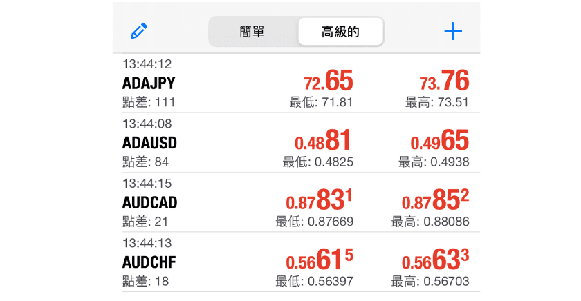 「行情」界面显示各个交易品种的价格清单。可以查看交易品种的即时卖价和买价,以及当天的最高价和最低价等资料。