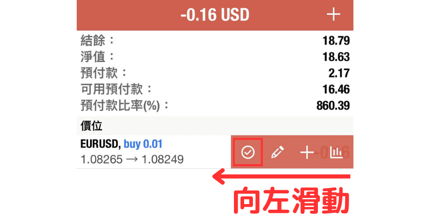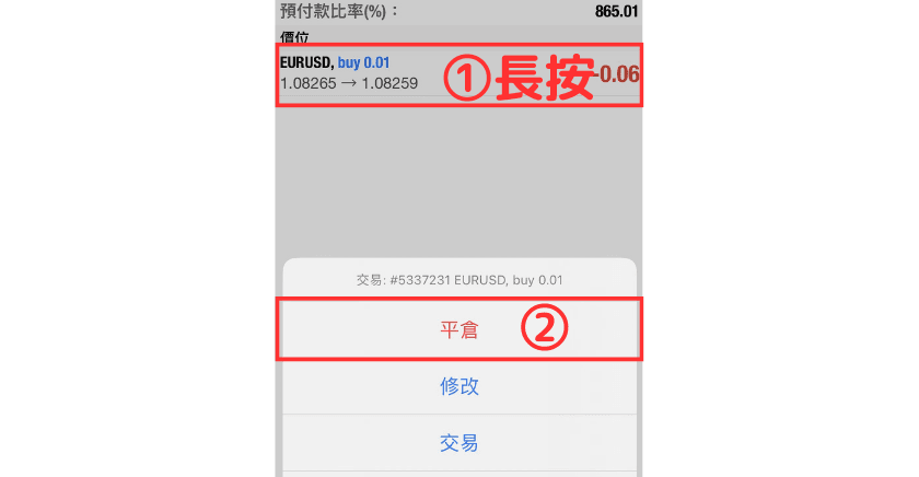 iOS版(iPhone/iPad)MT4(MetaTrade 4)的平仓(结算订单)方法很简单,只要在「交易」界面上即可快速完成。